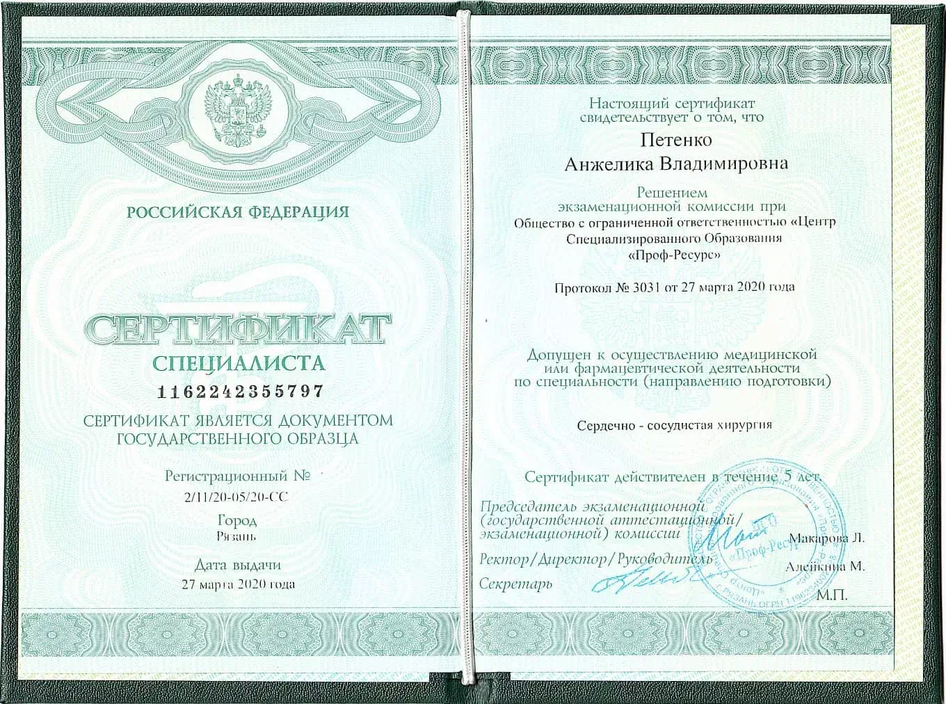 • 2020 — Центр специализированного образования "Проф-Ресурс" (направление: сердечно-сосудистая хирургия).